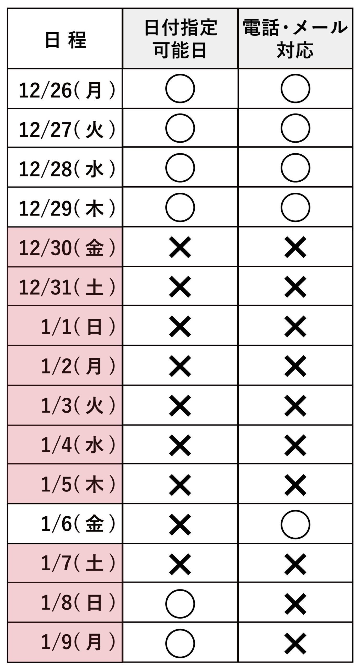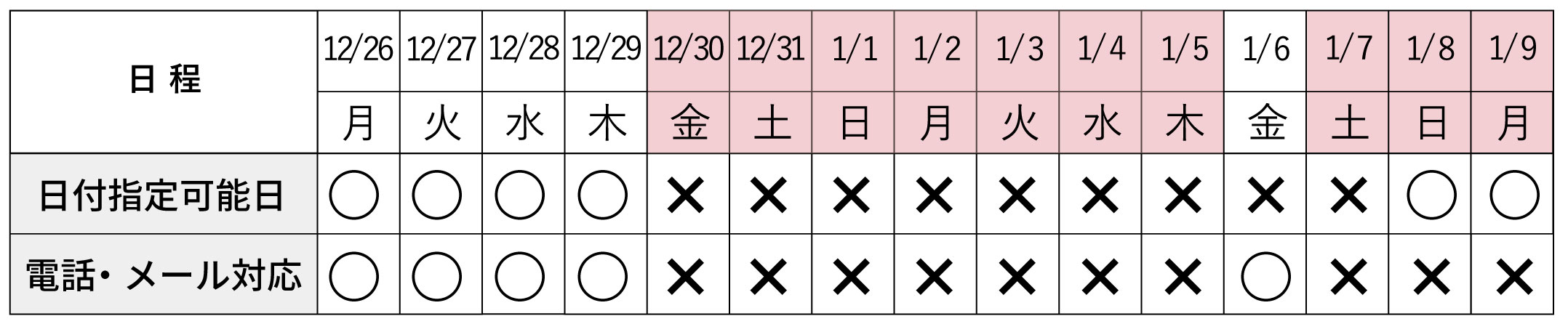 年末年始休業前受注締め日:12月27日(火) 午前12時(正午)まで