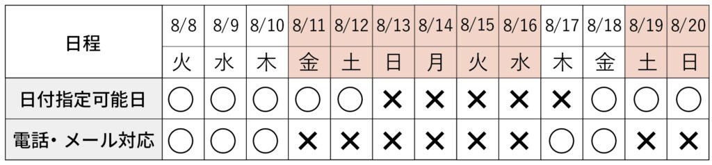 8/10(木)18時以降のメール、電話等の各種お問い合わせにつきましては、8/17(木)以降のご対応となります。