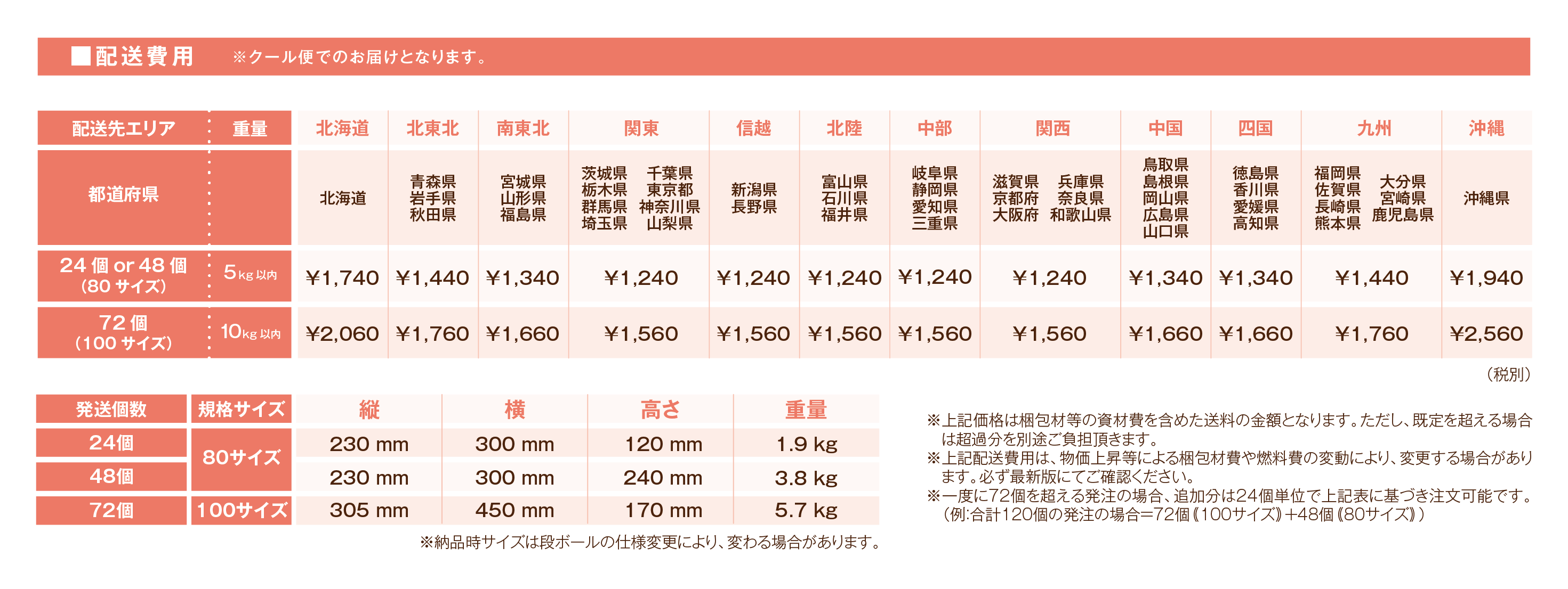 配送料につきましては、24 個入り段ボール及び48 個入り段ボールが80サイズ、72 個入り段ボールが100サイズとなります。