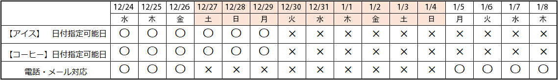 年末年始休業前に発送可能な受注締め日:12月24日(水) 午前12時(正午)まで